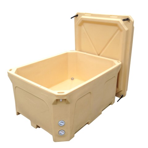 Grands glacières coffres de taille commerciale en 450L / 600L / 800L et 1000L de capacité, roto moulées pour la résistance. Idéal pour le stockage et le transport de produits frais réfrigérés. La base de conception de la palette permet de les déplacer facilement avec une prise de fourche ou une prise de palette.
